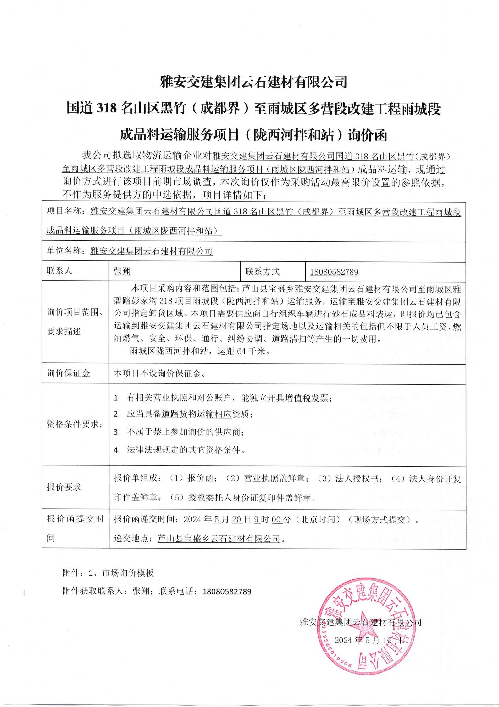 雅安交建集團云石建材有限公司國道318名山區(qū)黑竹(成都界)至雨城區(qū)多營段改建工程雨城段成品料運輸服務(wù)項目(雨城區(qū)隴西河拌和站)詢價函