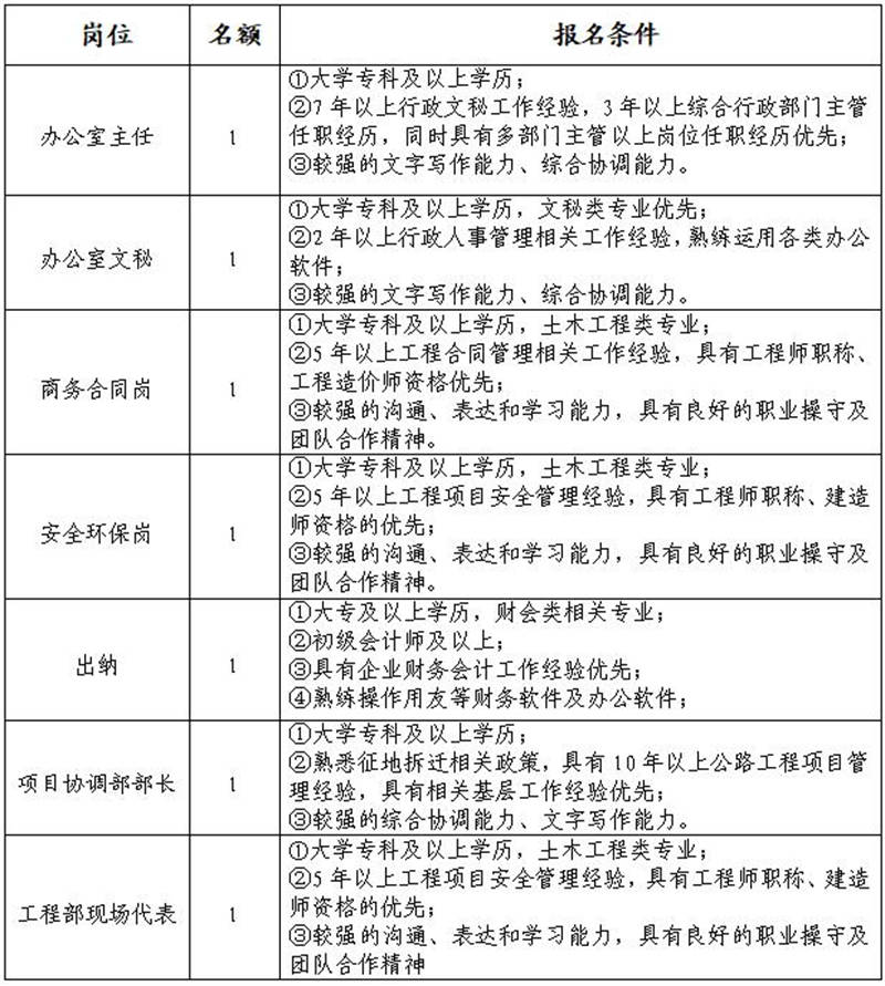 雅安交建集團(tuán)資產(chǎn)經(jīng)營管理有限公司是雅安市重點國有企業(yè)雅安市交建集團(tuán)下屬子公司,主要從事企業(yè)資產(chǎn)經(jīng)營管理;項目投資;土地整理等業(yè)務(wù)。根據(jù)公司發(fā)展需要,決定面向社會公開招聘7名工作人員,現(xiàn)將有關(guān)事項公告如下: