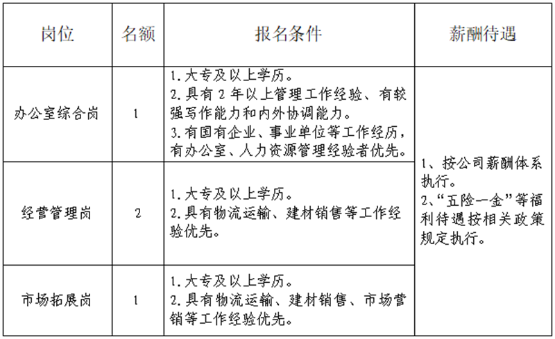 雅安交建集團運通貿(mào)易有限公司是雅安市交通建設(shè)(集團)有限責任公司下屬子公司。主要從事普通貨運、建材銷售、供應(yīng)鏈管理、貨運代理、貨運信息咨詢服務(wù)、倉儲配送服務(wù)等工作。現(xiàn)根據(jù)公司業(yè)務(wù)發(fā)展需要,決定招聘4名工作人員,現(xiàn)將有關(guān)事項公告如下: