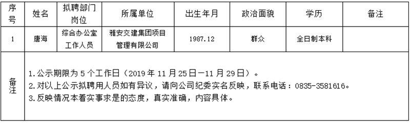 雅安交建集團(tuán)子公司擬聘用人員公示(大興公司)