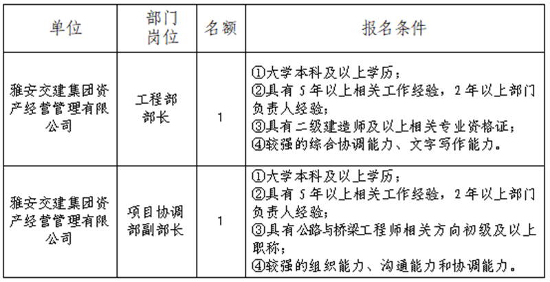 根據(jù)發(fā)展需要,決定面向社會公開招聘雅安市交通建設(shè)(集團)有限責(zé)任公司(以下簡稱“雅安交建集團”)所屬子公司工作人員2名,現(xiàn)將有關(guān)事項公告如下: