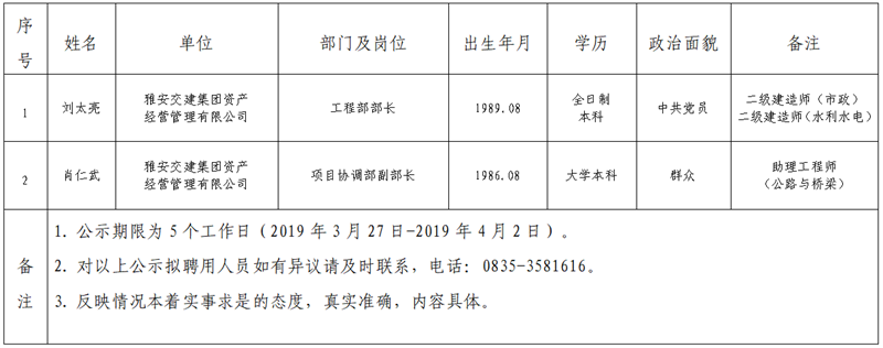 雅安交建集團(tuán)子公司擬聘用人員公示(資產(chǎn)經(jīng)營(yíng)管理公司)