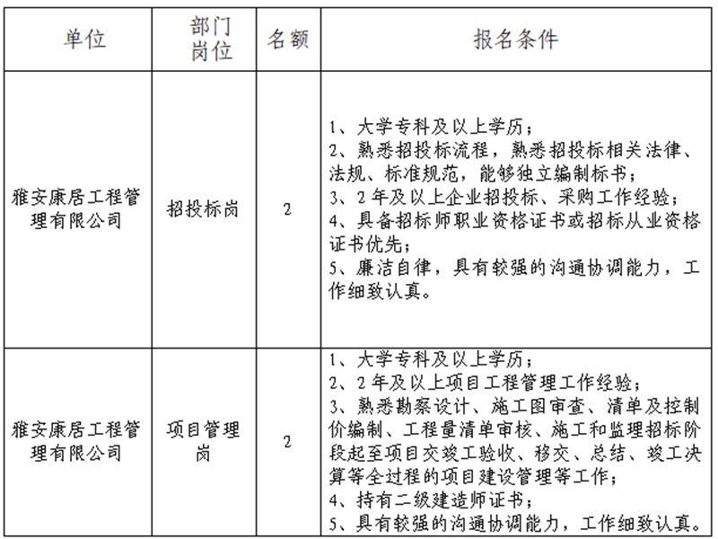 根據(jù)發(fā)展需要,決定面向社會公開招聘雅安市交通建設(shè)(集團(tuán))有限責(zé)任公司(以下簡稱“雅安交建集團(tuán)”)所屬子公司工作人員4名,現(xiàn)將有關(guān)事項公告如下: