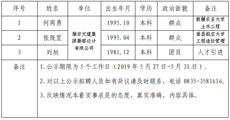 雅安交建集團子公司擬聘用人員公示(路橋公司)