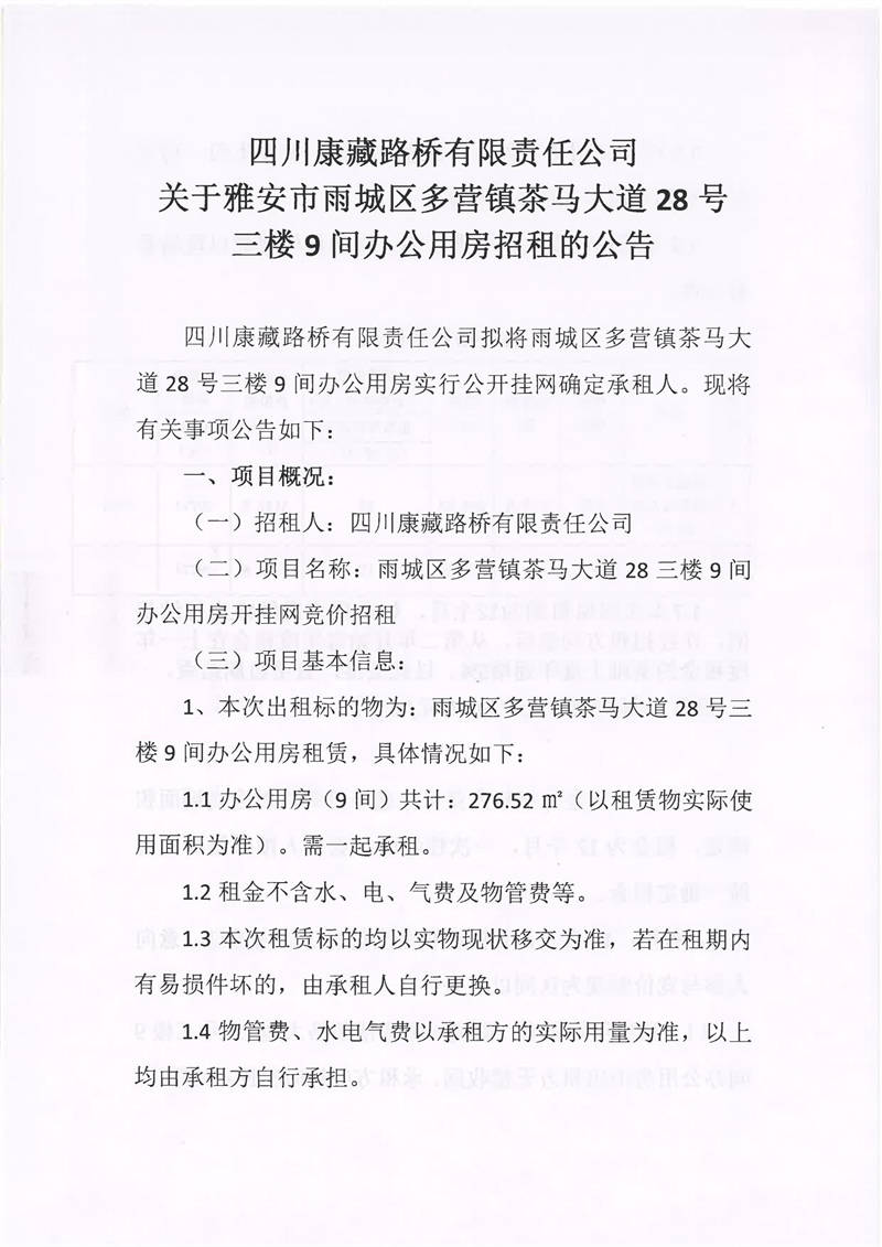 四川康藏路橋有限責(zé)任公司關(guān)于雅安市雨城區(qū)多營鎮(zhèn)茶馬大道28號(hào)三樓9間辦公用房招租的公告