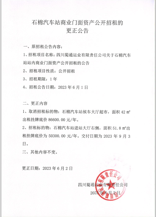 蜀通公司石棉汽車站商業(yè)門面資產公開招租的更正公告