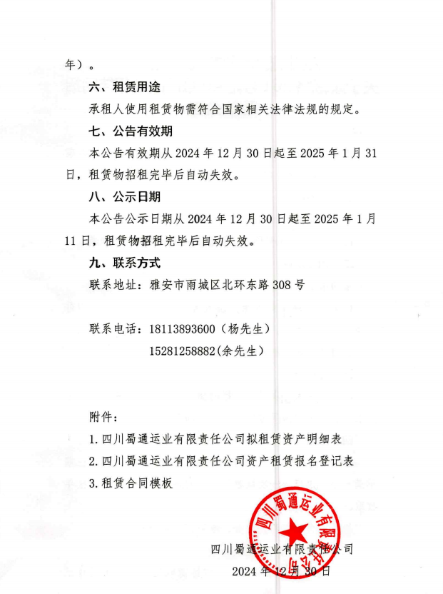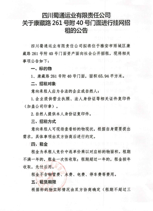 四川蜀通運(yùn)業(yè)有限責(zé)任公司 關(guān)于康藏路261號附40號門面進(jìn)行掛網(wǎng)招租的公告