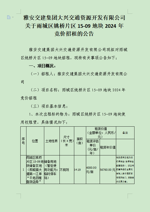 雅安交建集團(tuán)大興交通資源開發(fā)有限公司關(guān)于雨城區(qū)姚橋片區(qū)15-09地塊2024年競價招租的公告