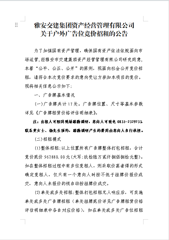 雅安交建集團資產(chǎn)經(jīng)營管理有限公司關(guān)于戶外廣告位競價招租的公告
