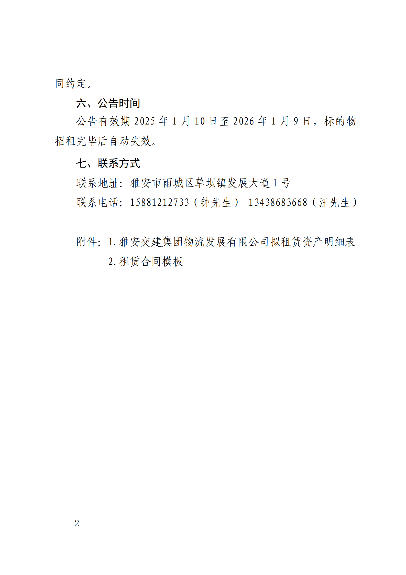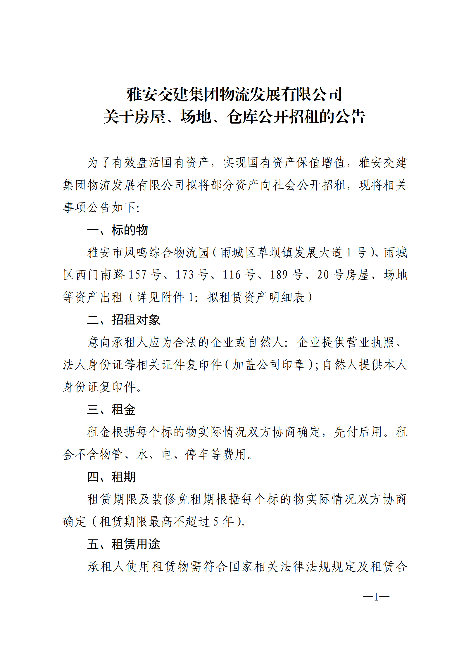 雅安交建集團物流發(fā)展有限公司 關于房屋、場地、倉庫公開招租的公告