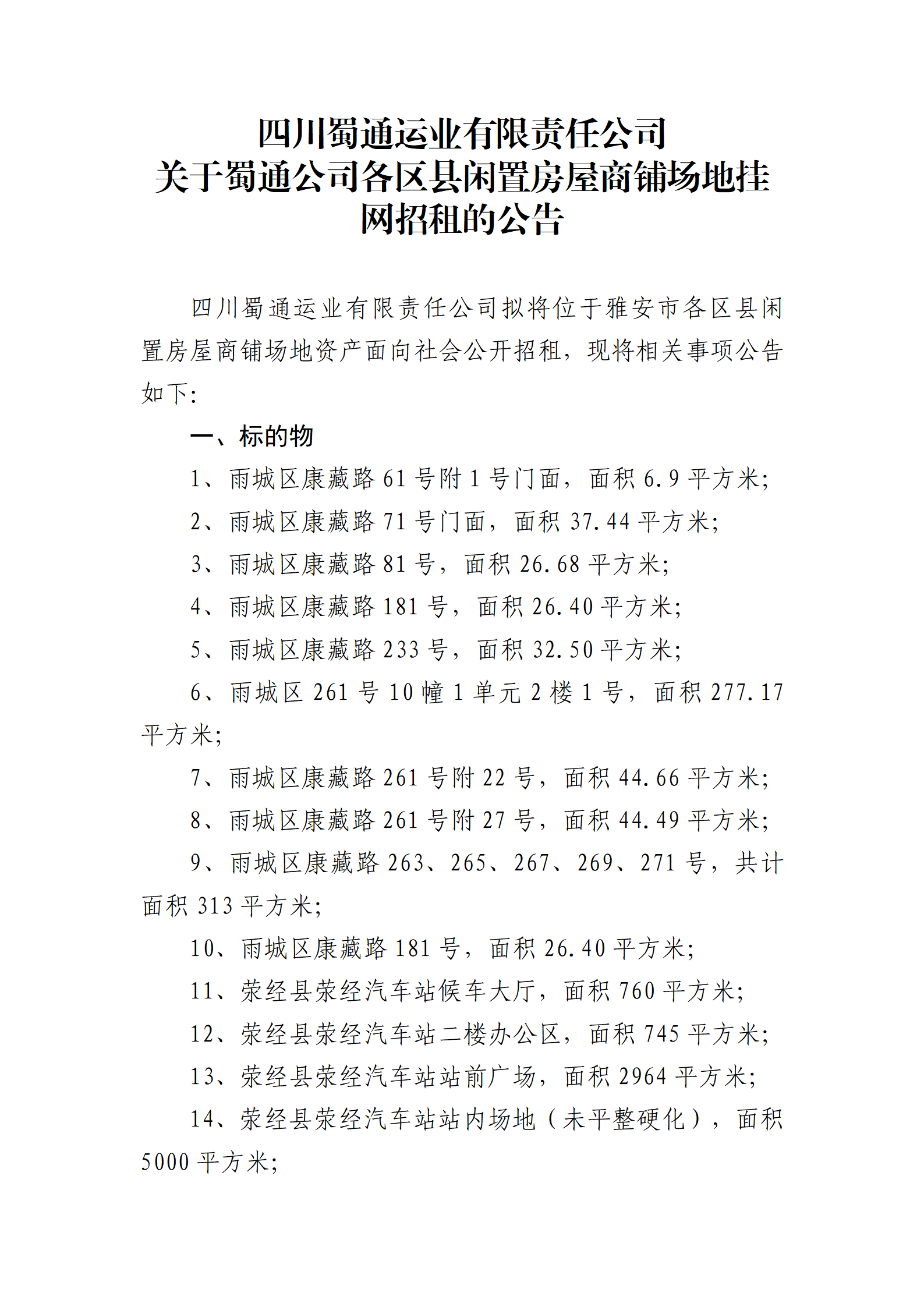 四川蜀通運業(yè)有限責(zé)任公司關(guān)于蜀通公司各區(qū)縣閑置房屋商鋪場地掛網(wǎng)招租的公告
