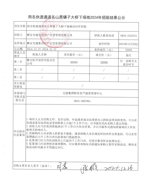 雨名快速通道名山黑碾子大橋下場(chǎng)地2024年招租結(jié)果公示