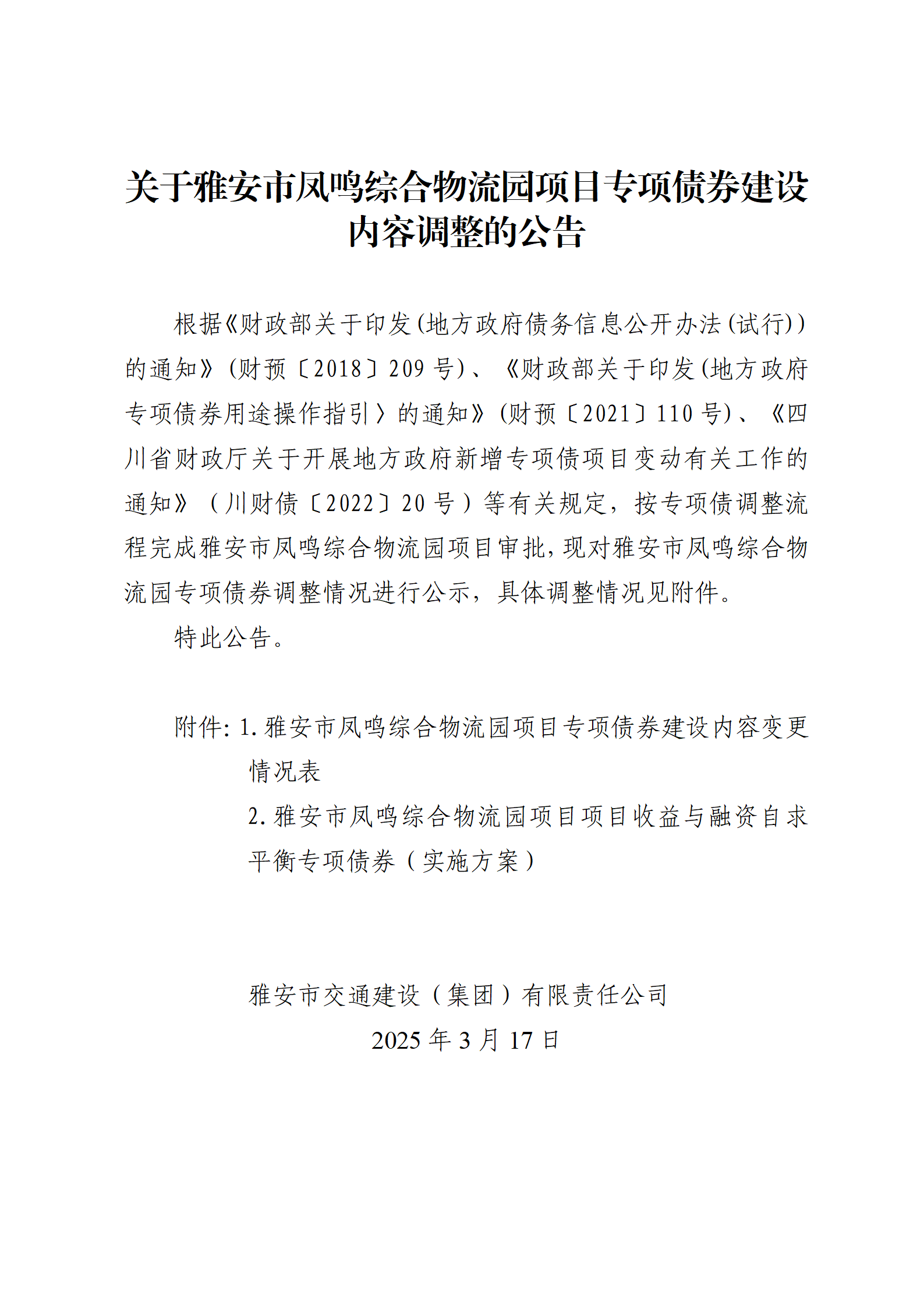 關(guān)于雅安市鳳鳴綜合物流園項(xiàng)目專(zhuān)項(xiàng)債券建設(shè)內(nèi)容調(diào)整的公告