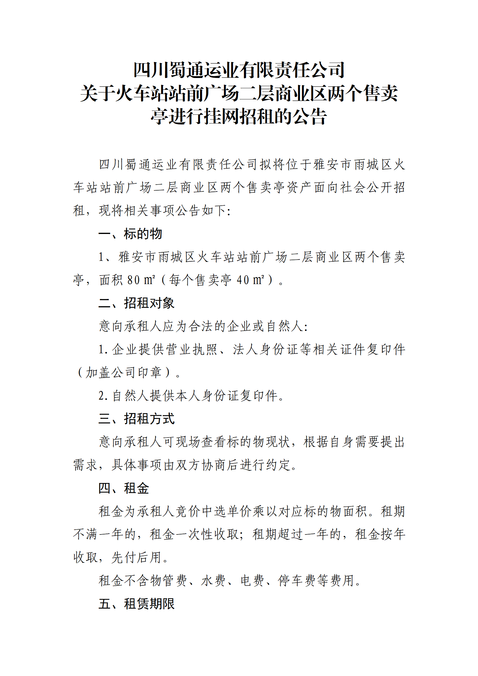 四川蜀通運(yùn)業(yè)有限責(zé)任公司關(guān)于火車站站前廣場二層商業(yè)區(qū)兩個(gè)售賣亭進(jìn)行掛網(wǎng)招租的公告