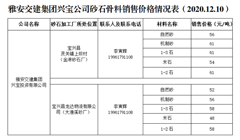 雅安交建集團(tuán)興寶公司砂石骨料銷(xiāo)售價(jià)格情況表(2020.12.10)