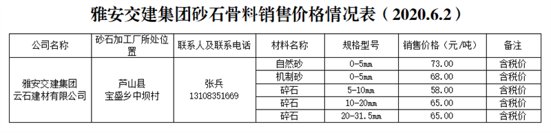 雅安交建集團云石建材砂石骨料銷售價格情況表(2020.6.2)