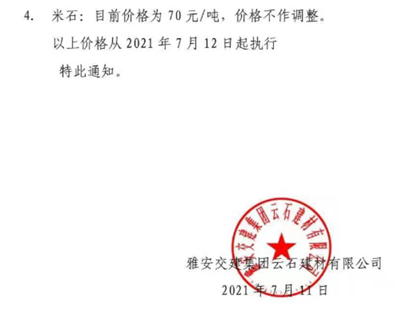 雅安交建集團云石公司砂石骨料銷售價格情況表(2021.7.12)