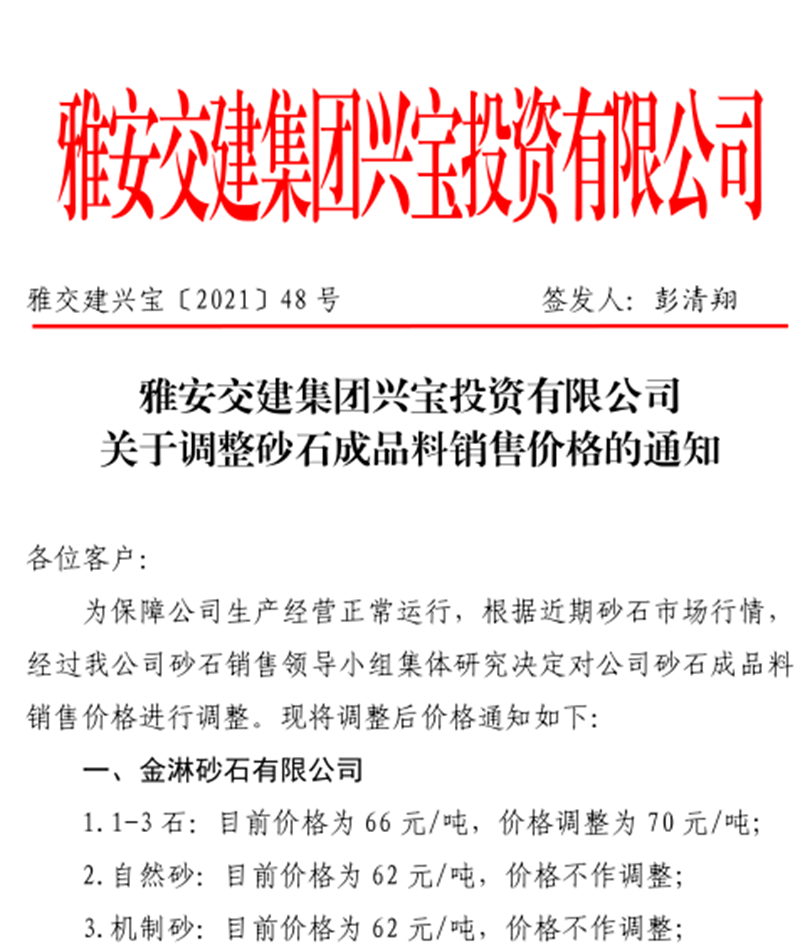 雅安交建集團(tuán)興寶公司砂石骨料銷售價格情況表(2021.8.12)