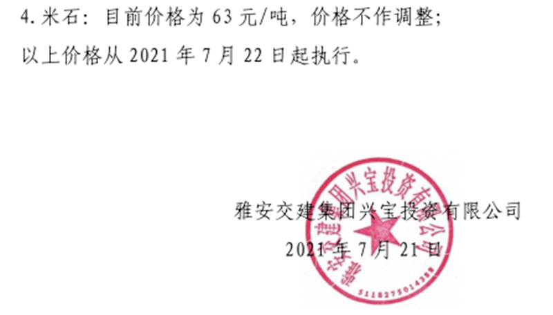 雅安交建集團(tuán)興寶公司砂石骨料銷售價格情況表(2021.7.22)