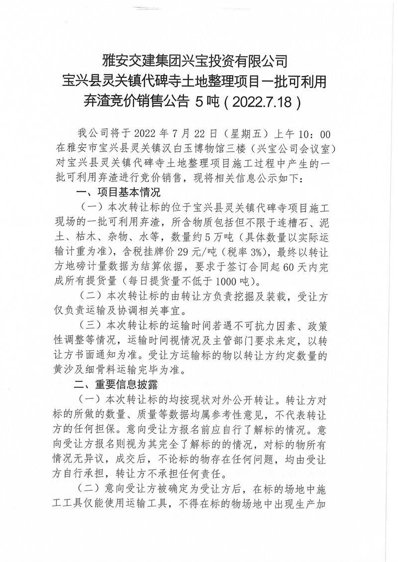 寶興縣靈關(guān)鎮(zhèn)代碑寺土地整理項(xiàng)目一批可利用棄渣競(jìng)價(jià)銷售公告7.18(5萬噸)