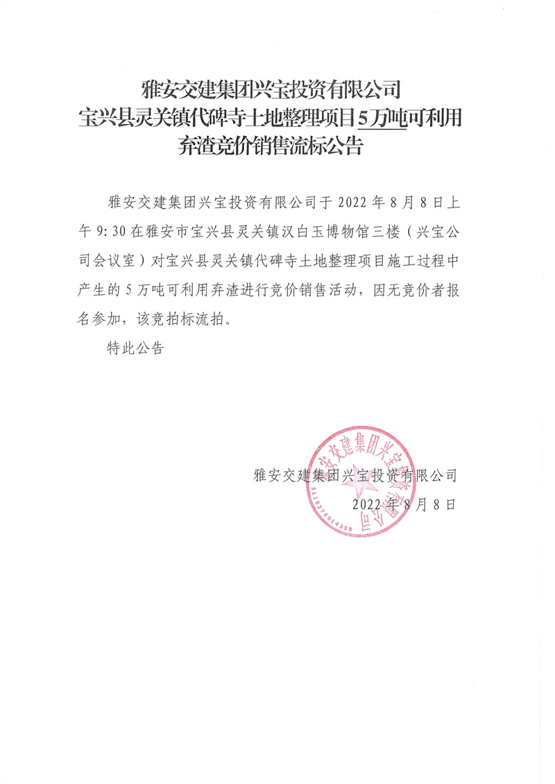 代碑寺土地整理項(xiàng)目5萬(wàn)噸可利用棄渣競(jìng)價(jià)銷(xiāo)售流標(biāo)公告