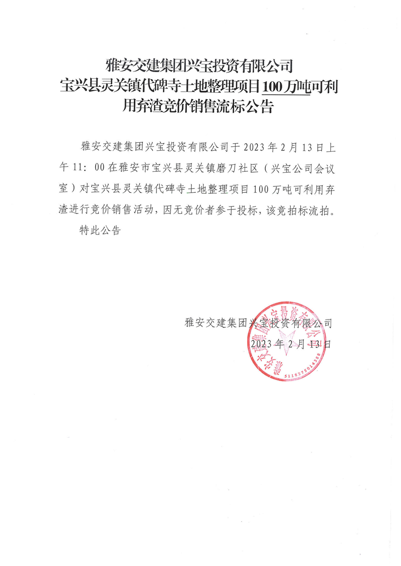 雅安交建集團(tuán)興寶投資有限公司100萬噸可利用棄渣競價(jià)銷售流標(biāo)公告(2023.2.13)