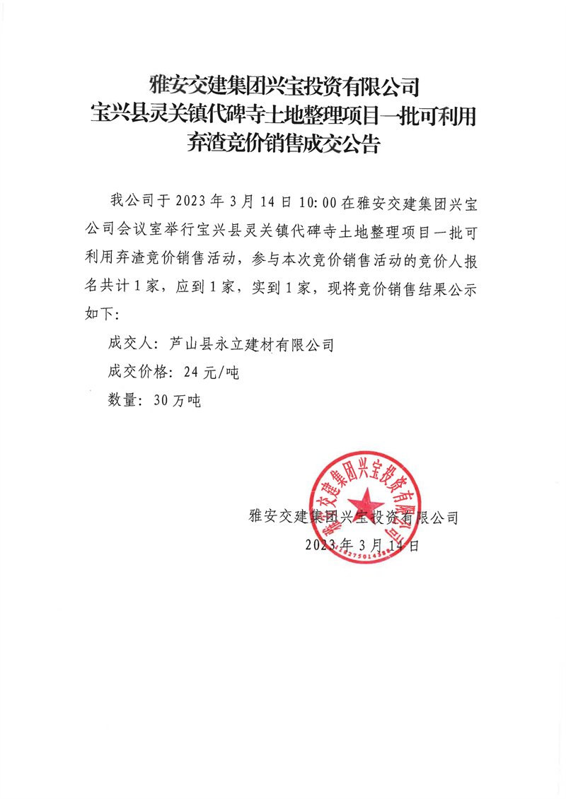 雅安交建集團(tuán)興寶投資有限公司30萬噸可利用棄渣競價銷售成交公告、5萬噸細(xì)骨料竟價成效公告(2023.3.14)